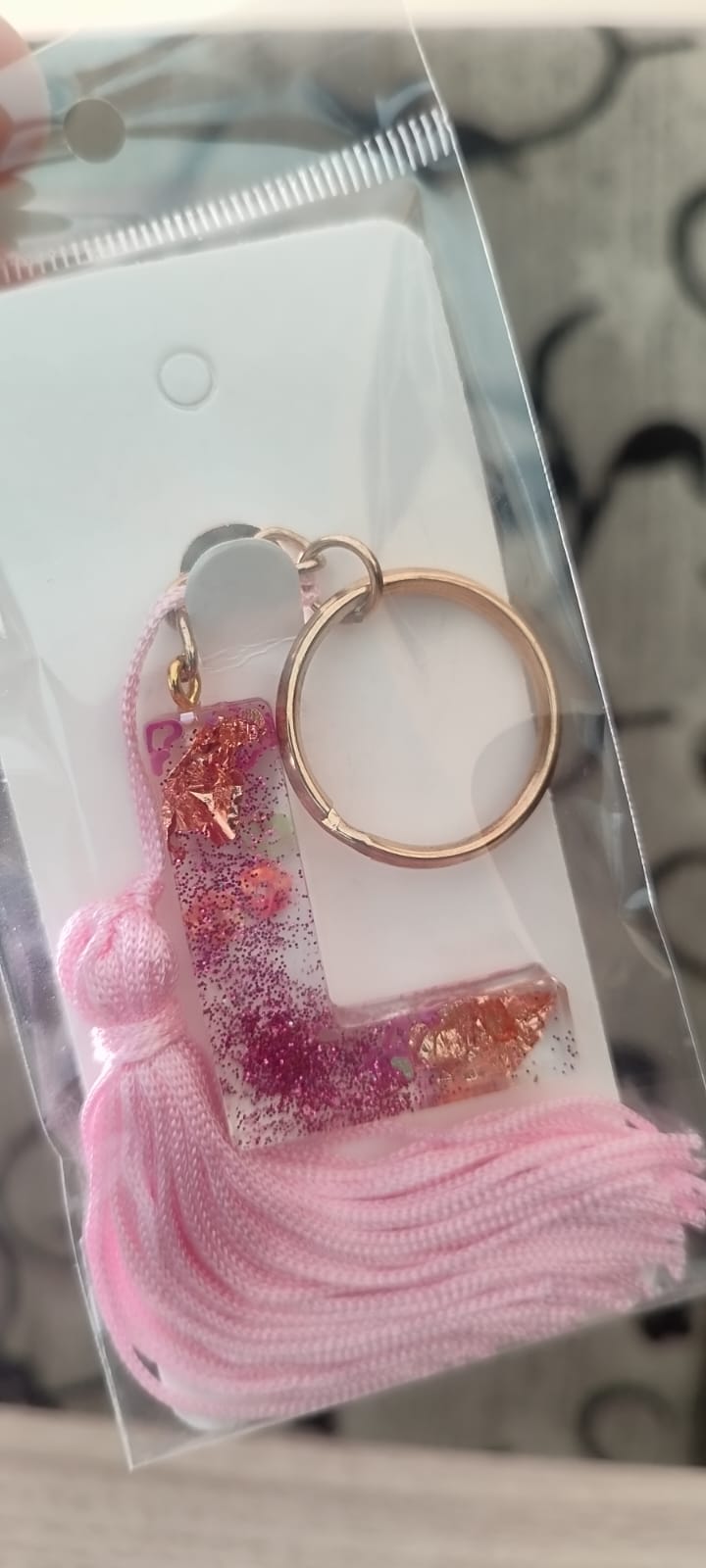 Chaveiro Inicial Personalizada – Resina Premium ''L'' (tassel rosa)